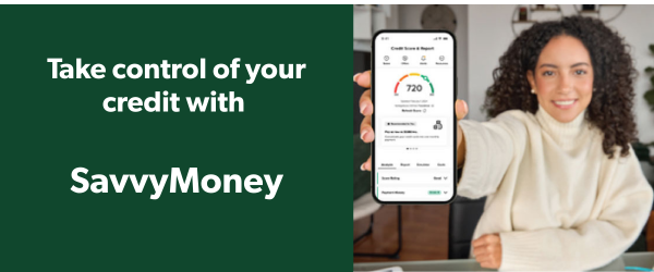 Take control of your credit with SavvyMoney! Available at no cost to members in both Mobile and Online banking, SavvyMoney allows you to check your credit score, set custom credit-building goals, and access personalized product offers tailored to you and your finances. Log in to mobile or online banking today to get started!